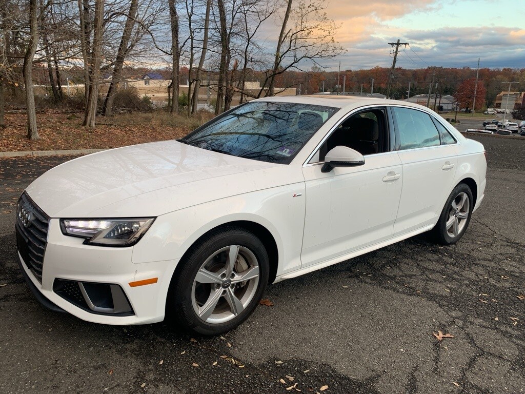 2019 Audi A4 2.0T Premium quattro Ibis White 7-Speed Automatic S tronic 4D Sedan 2.0L I4 TFSI DOHC quattro. Alarm System w/Motion Sensor, Audi Advanced Key, Audi Beam-Rings, Audi Pre Sense Rear, Audi Side Assist w/Rear Cross Traffic Assist, Audi smartphone interface (Apple CarPlay/Android Auto), Auto-Dimming Exterior Mirrors, Convenience Package, Exterior Parking Camera Rear, Genuine wood console insert, Genuine wood dashboard insert, Genuine wood door panel insert, Heated door mirrors, Heated Front Bucket Seats, High intensity discharge headlights: Xenon plus, Illuminated entry, Leather Seating Surfaces, Leather Shift Knob, Leather steering wheel, Memory for Driver's Seat, Power moonroof, Rain sensing wipers, Rear fog lights, SiriusXM Satellite Radio, Split folding rear seat.